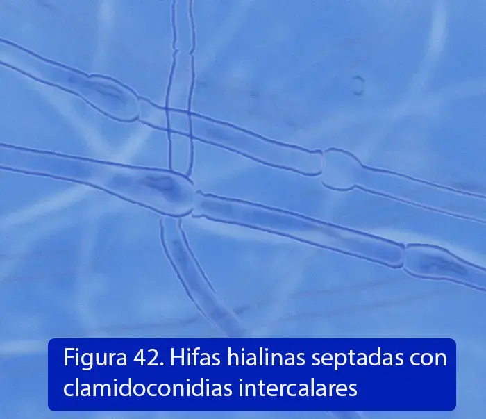 Hifas septadas con numerosos macroconidios de pared delgada con extremos redondeados. Los microconidios tienen forma redondeada en un extremo y más delgado en la base, se ubican individualmente en los laterales de la hifa. En cultivos antiguos, ocasionalmente se pueden identificar clamidosporas (58).